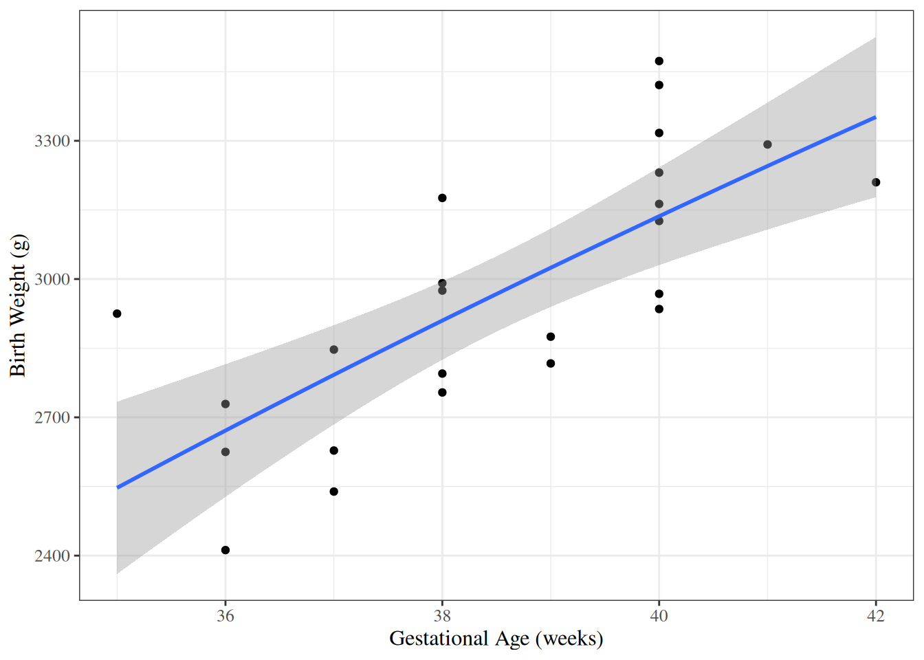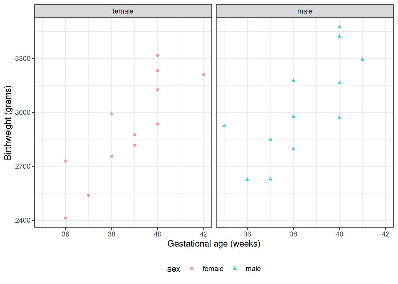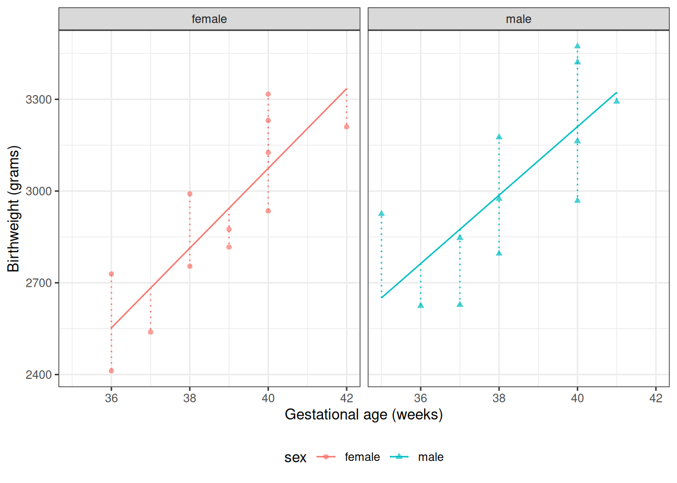 From Model 6, \(\gamma_0\) is the mean birthweight among females (\(M = 0\)) with \(A^* = 0\) (i.e., \(A = 32\) weeks):