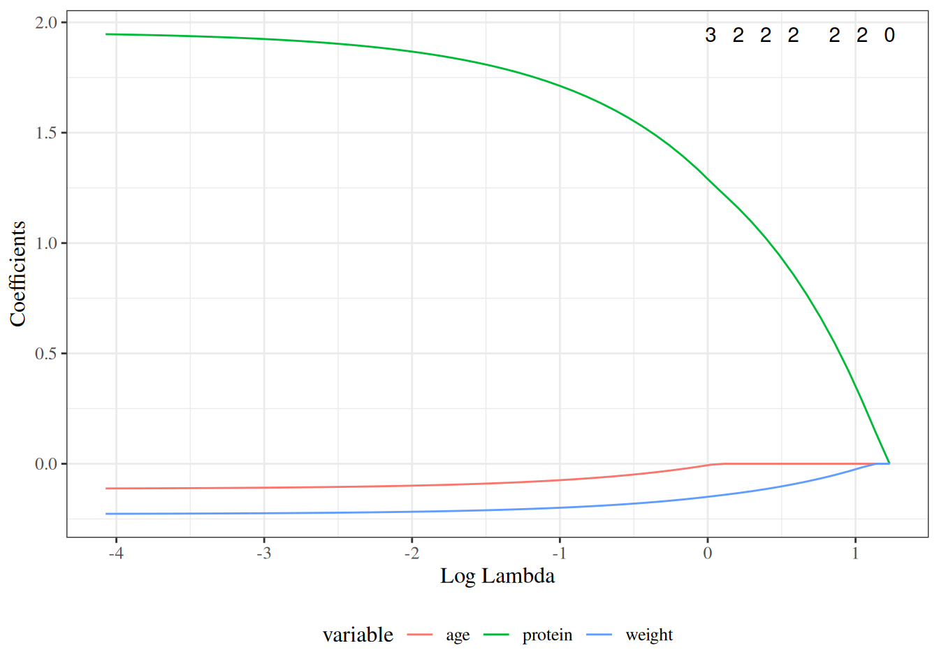 Coefficients change only for variables that have interactions with the rescaled variable \(A\). This includes the intercept (which can be viewed as the main effect of a variable that interacts with \(A\) via \(\beta_A\)), and the main effect of \(M\) (which interacts with \(A\) via \(\beta_{AM}\)). Shifting \(A\) by 32 weeks changes the reference point from \(A = 0\) to \(A = 32\), so these coefficients now represent quantities evaluated at \(A = 32\) weeks rather than at \(A = 0\) weeks.