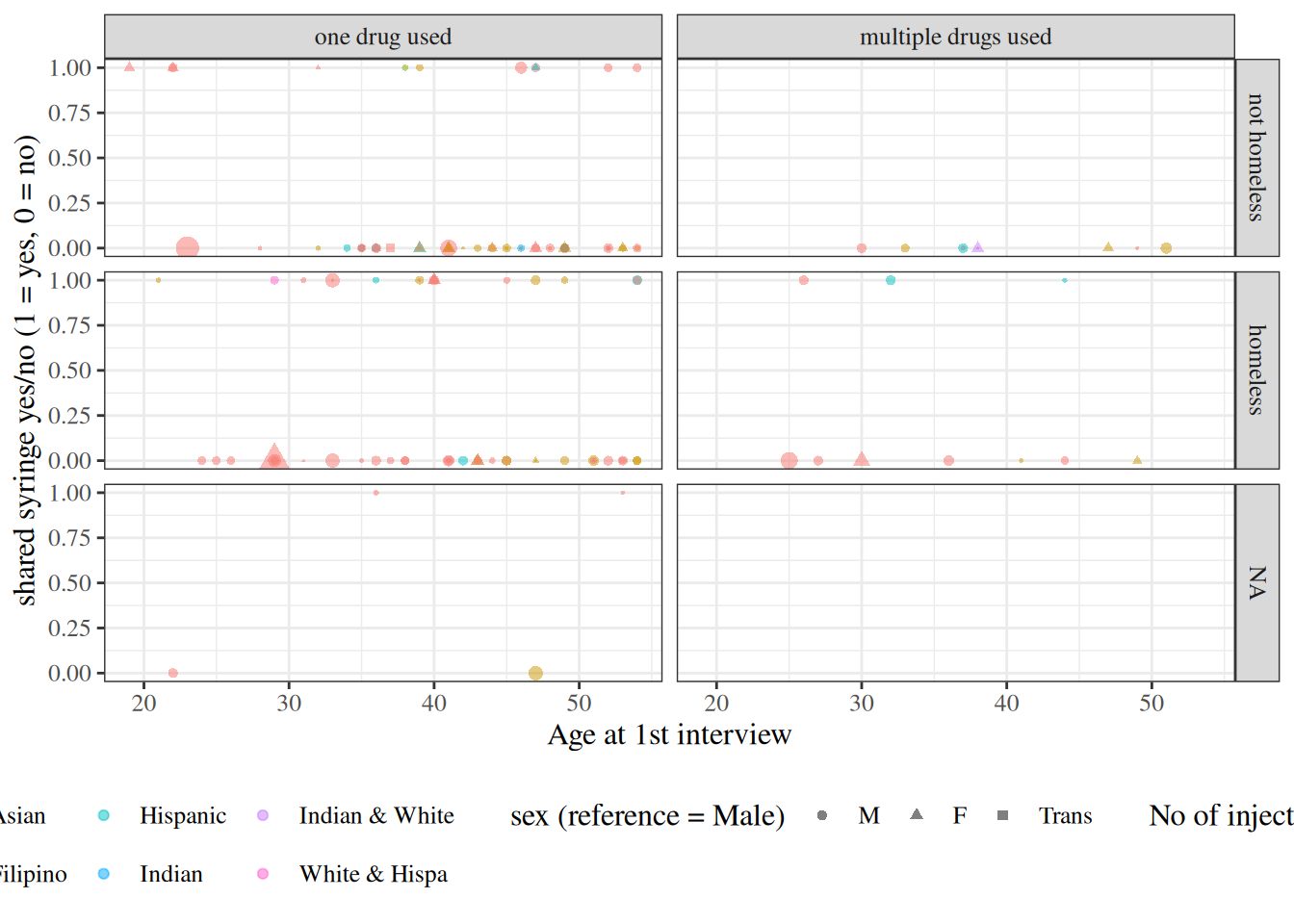 Table 3: Counts of observations in needles dataset by sex, unhoused status, and multiple drug use