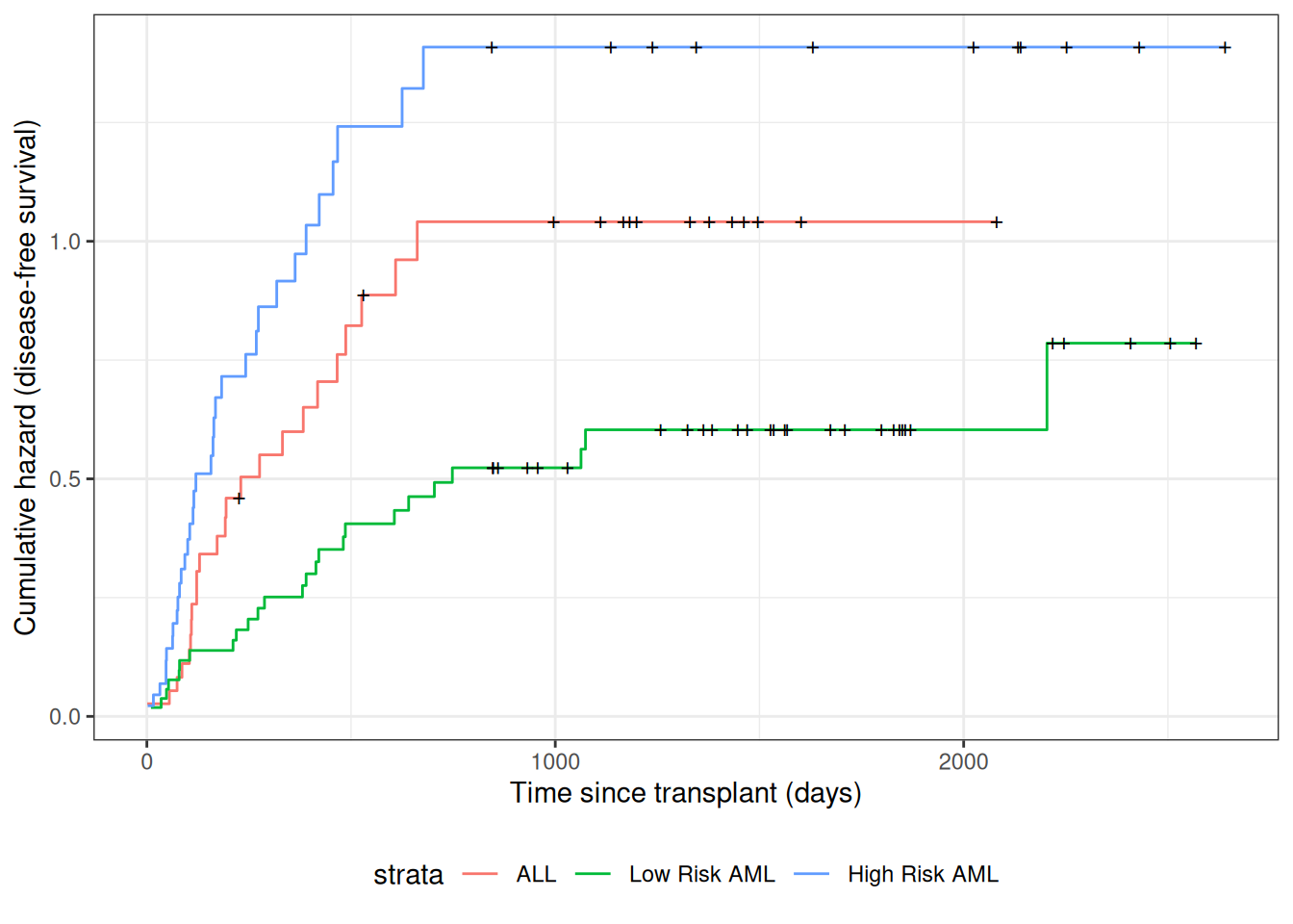 As we will see below, \({\Lambda}(t)\) is tractable to estimate, and we can then derive an estimate of the hazard function using an approximate derivative of the estimated cumulative hazard.