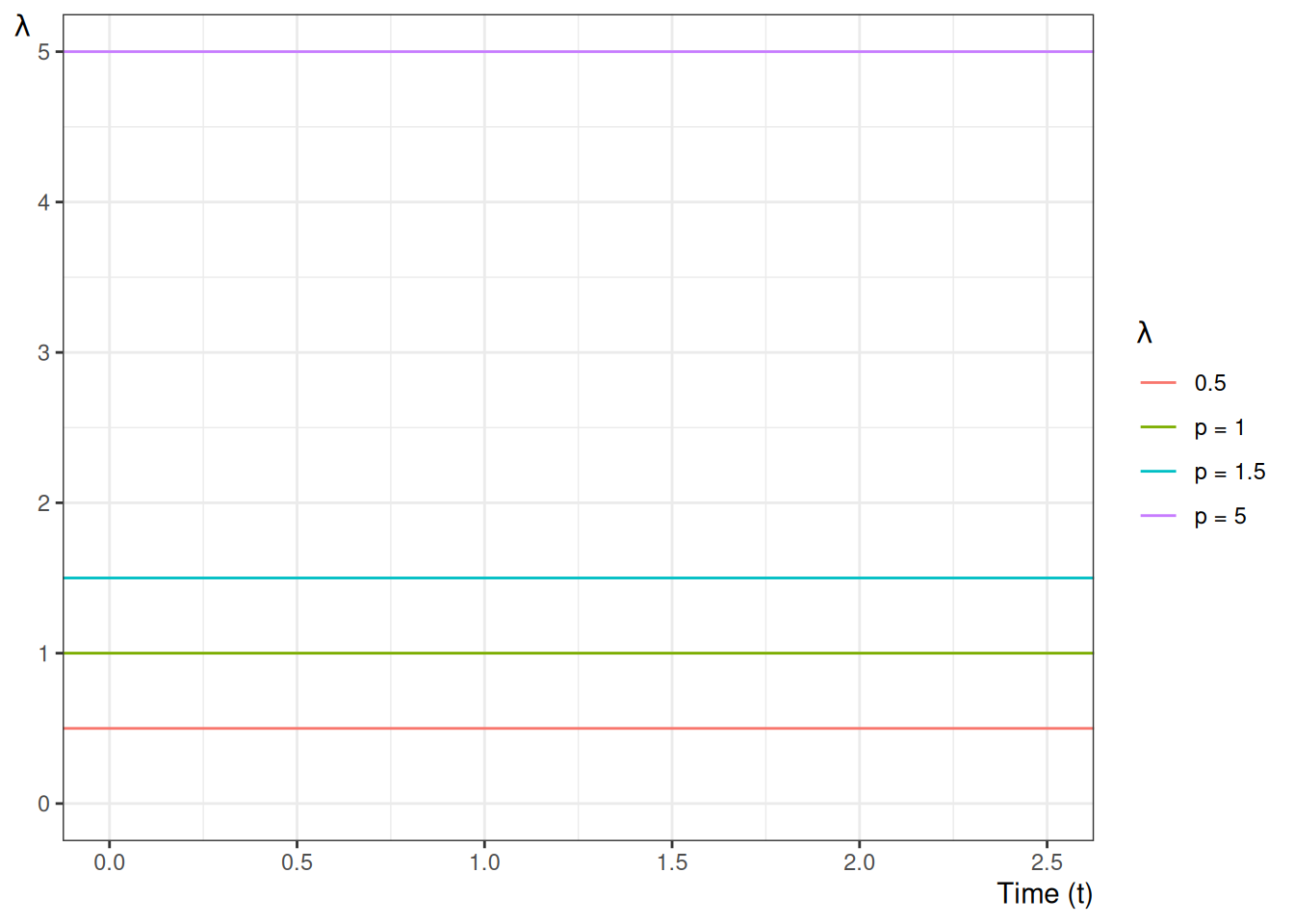 Theorem 4 (Incidence rate in a homogenous population) If a population of individuals indexed by \(i\) all have identical hazard rates \({\lambda}_i(t) = {\lambda}(t)\), then the incidence rate for that population is equal to the hazard rate: