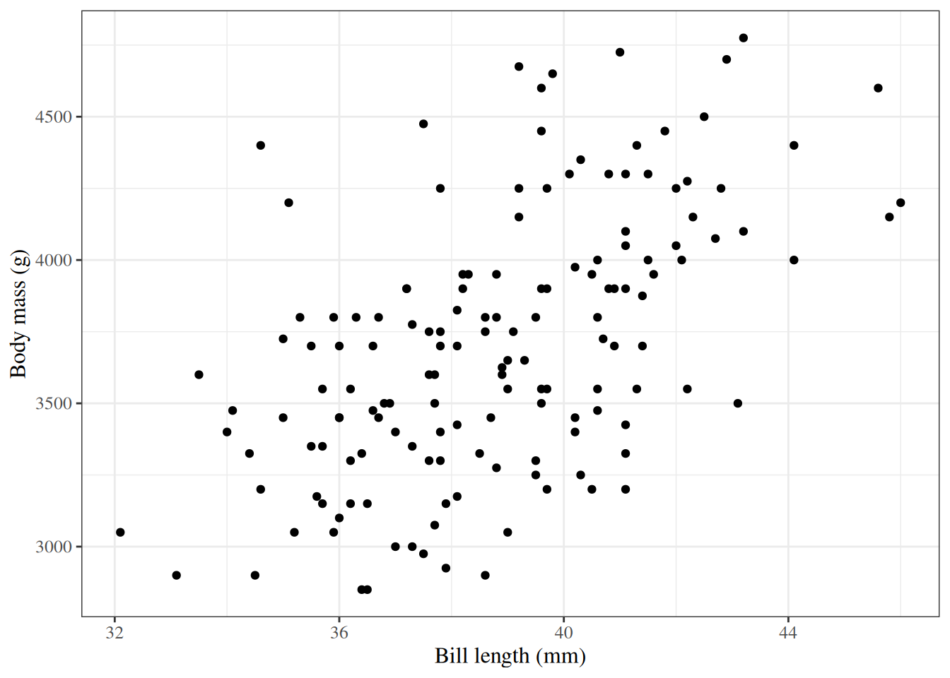 ggpenguins2<-ggpenguins+stat_smooth( method ="lm", formula =y~log(x), geom ="smooth")+xlab("Bill length (mm)")+ylab("Body mass (g)")ggpenguins2