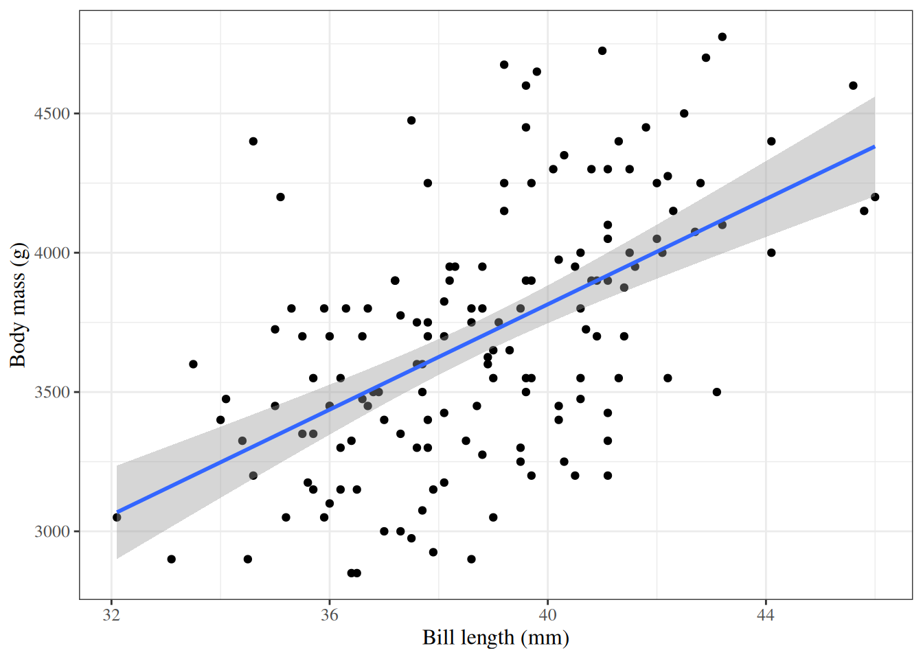 ggpenguins2<-ggpenguins+stat_smooth( method ="lm", formula =y~x, geom ="smooth")ggpenguins2|>print()