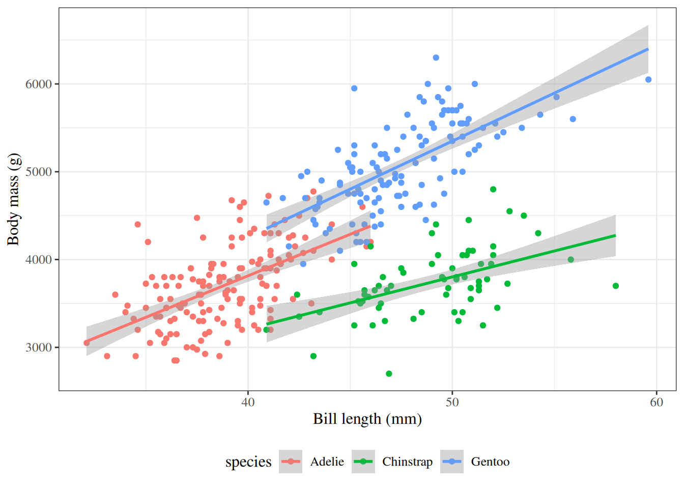 ggpenguins<-palmerpenguins::penguins|>ggplot(aes( x =bill_length_mm, y =body_mass_g, color =species))+geom_point()+stat_smooth( method ="lm", formula =y~x, geom ="smooth")+xlab("Bill length (mm)")+ylab("Body mass (g)")ggpenguins|>print()