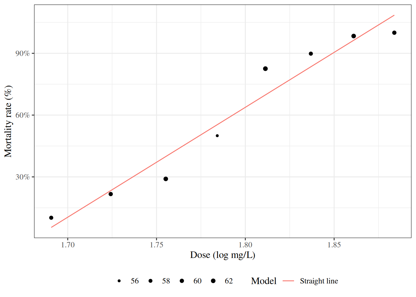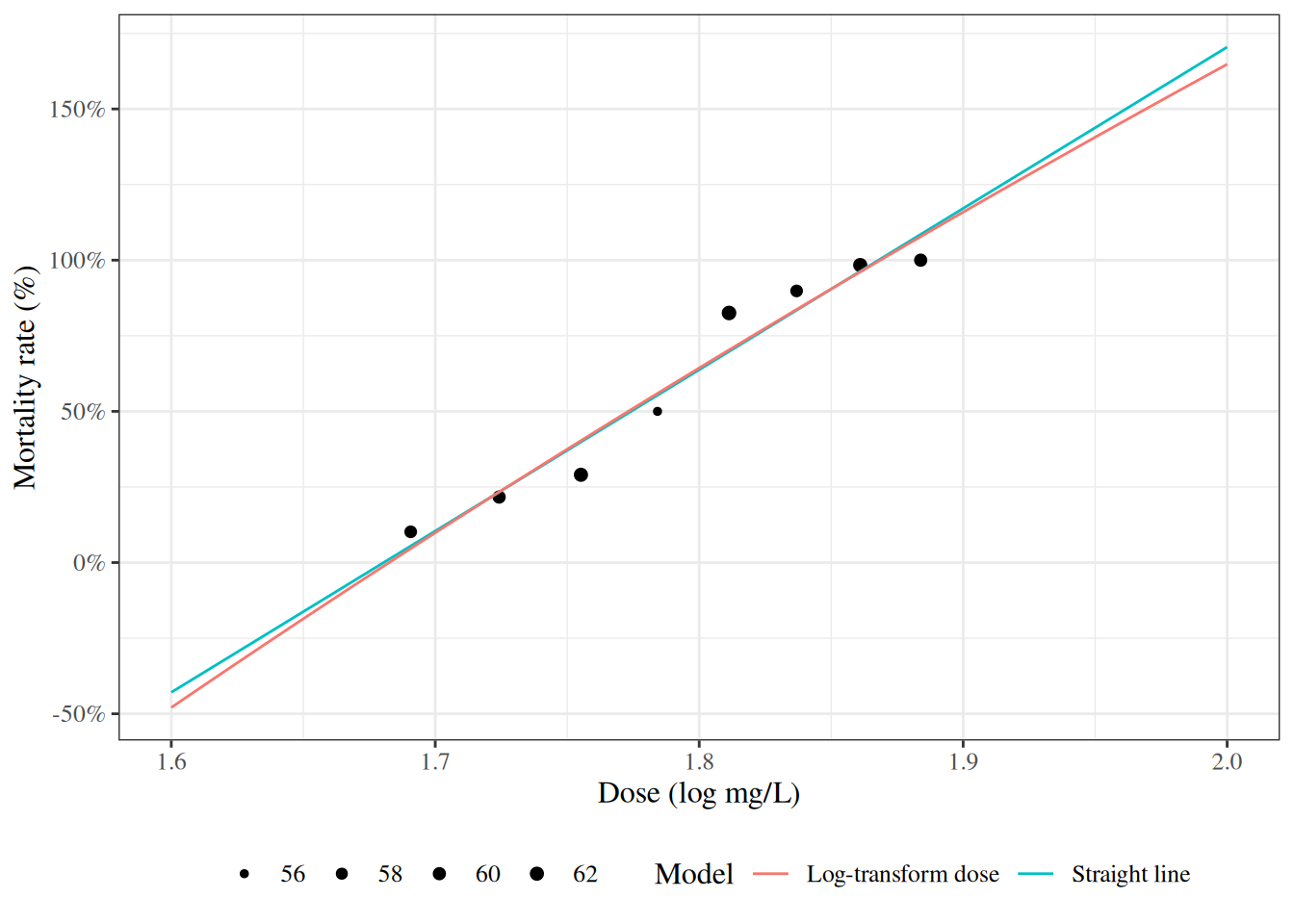 glm1<-beetles|>glm(formula =cbind(died, survived)~dose, family ="binomial")f<-function(x){glm1|>predict(newdata =data.frame(dose =x), type ="response")}plot4<-plot3+geom_function(fun =f, aes(col ="Logistic regression"))print(plot4)