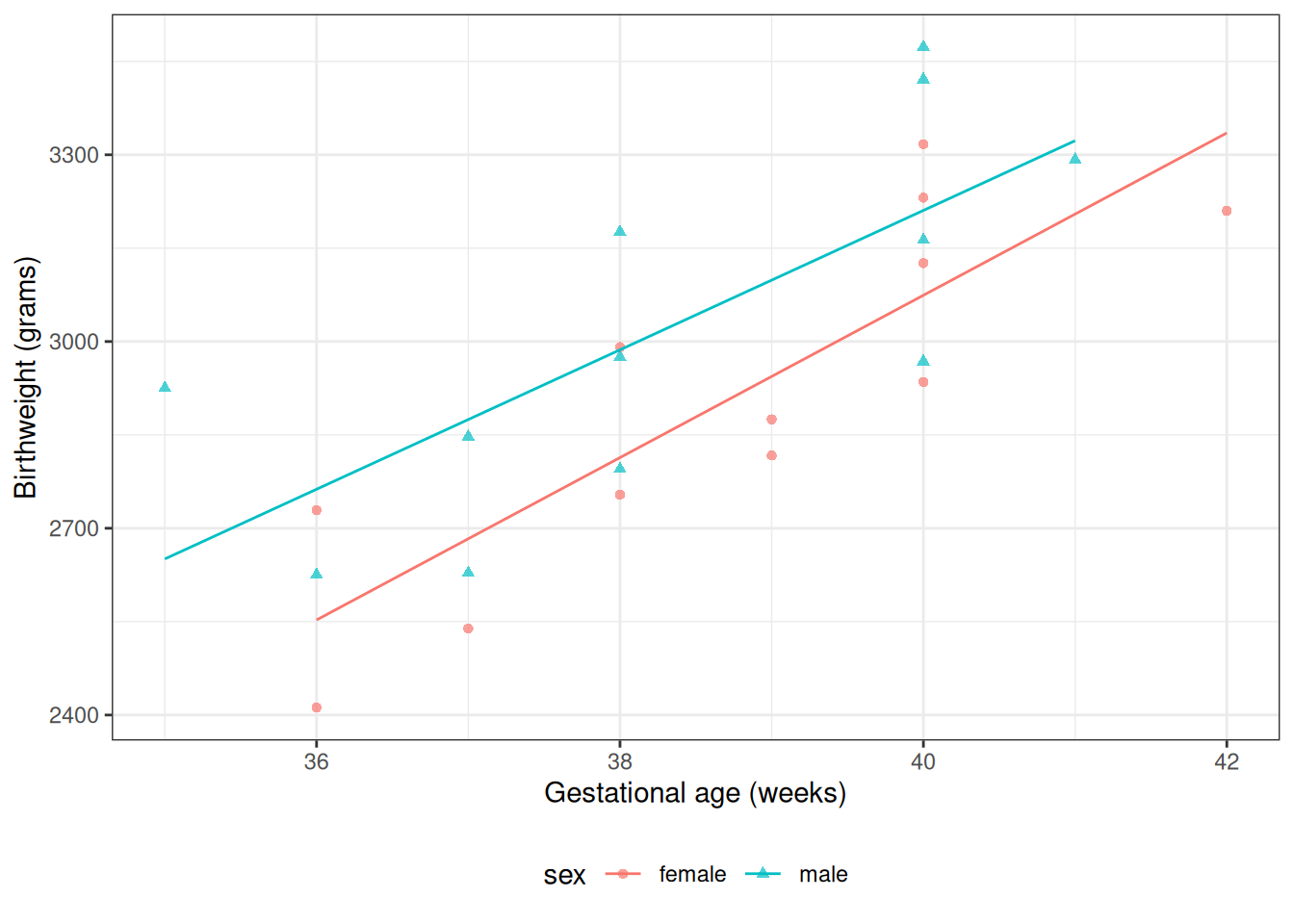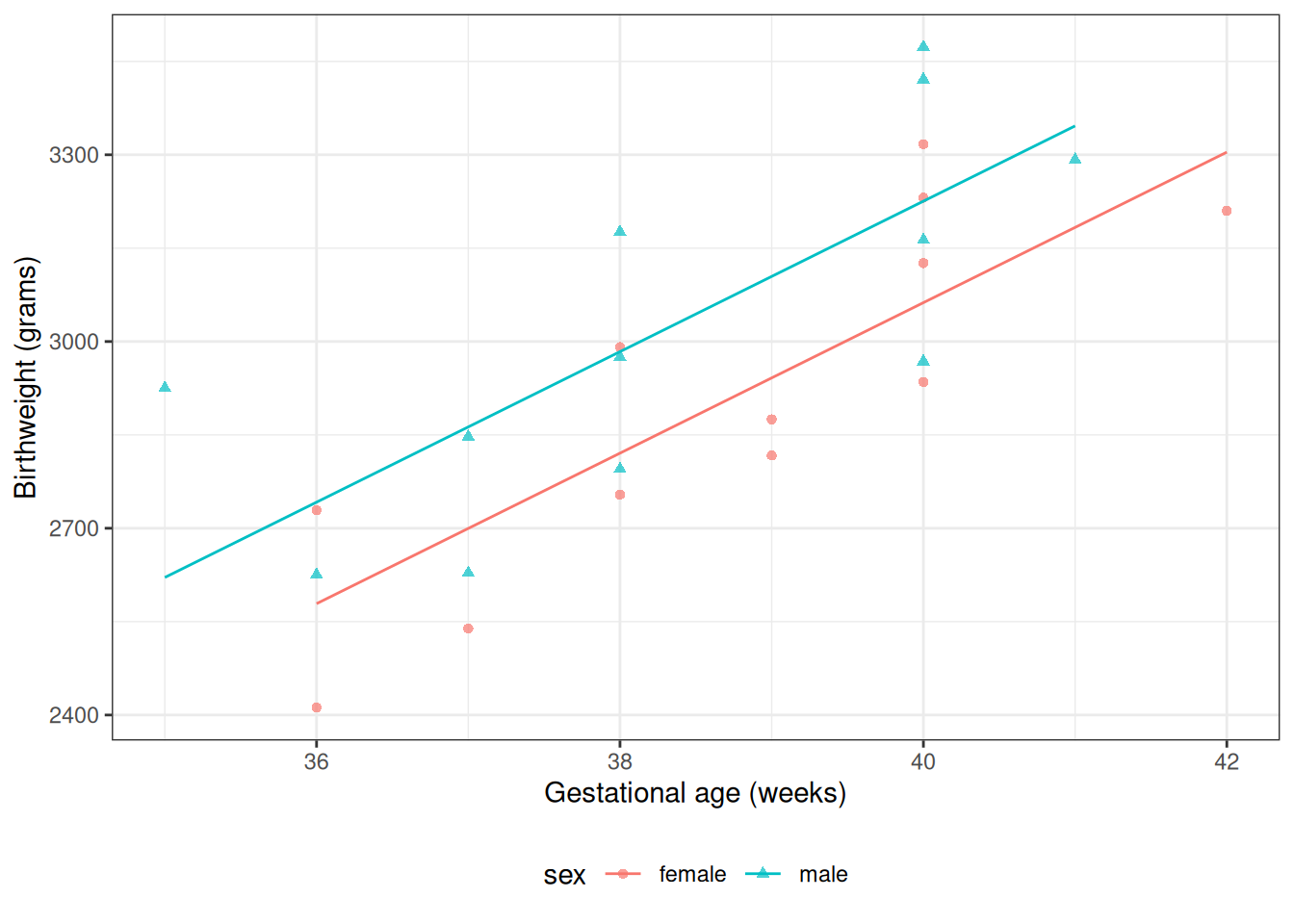 This differs from \(\beta_0 = \text{E}{\left[Y|M=0, A=0\right]}\), which is the mean birthweight among females at \(A = 0\) weeks.