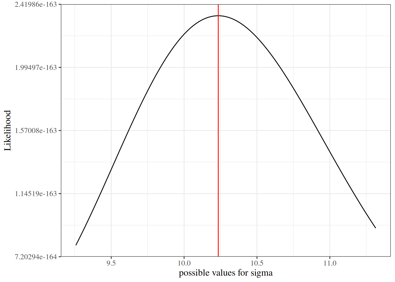 3.8 Likelihood and log-likelihood for \(\sigma^2\), conditional on \(\mu = \hat\mu\):
